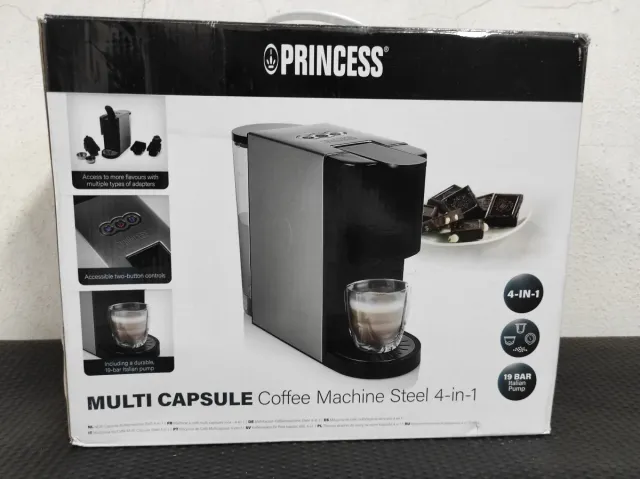 Detalles del productoCafetera Princess de acero inoxidable, modelo Multi Capsule 4-in-1.