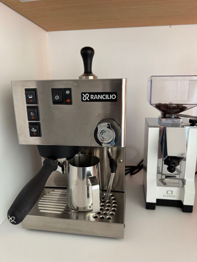 Se vende cafetera Rancilio junto con molinillo Eureka. - Cafetera de acero inoxidable. - Molinillo con tolva transparente.