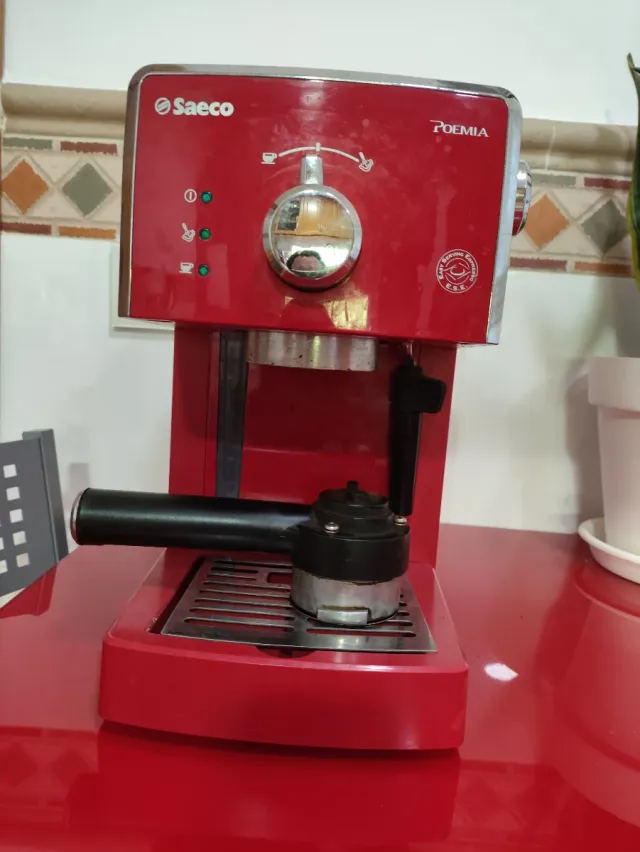 Cafetera Saeco Poemia de color rojo. Todos los accesorios. - Diseño compacto y elegante. - Incluye portafiltro. - Indicadores luminosos de funcionamiento.