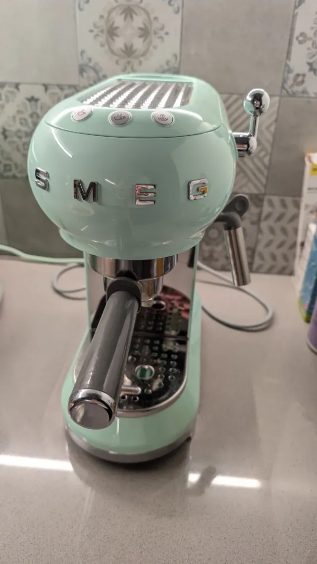 Detalles del productoCafetera Smeg en un bonito color verde menta, con un diseño retro y elegante.