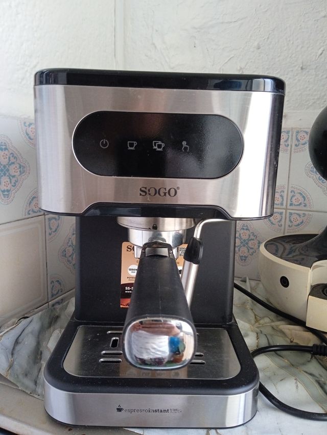 Cafetera Sogo modelo Espresso Instant 1255. - Diseño moderno en acero inoxidable y negro. - Panel de control con indicadores luminosos. - Portafiltro extraíble.
