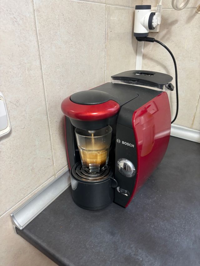 Cafetera Tassimo Bosch en color rojo. Ideal para preparar tu café favorito. - Diseño moderno. - Fácil de usar. - Funciona perfectamente como podeis ver.