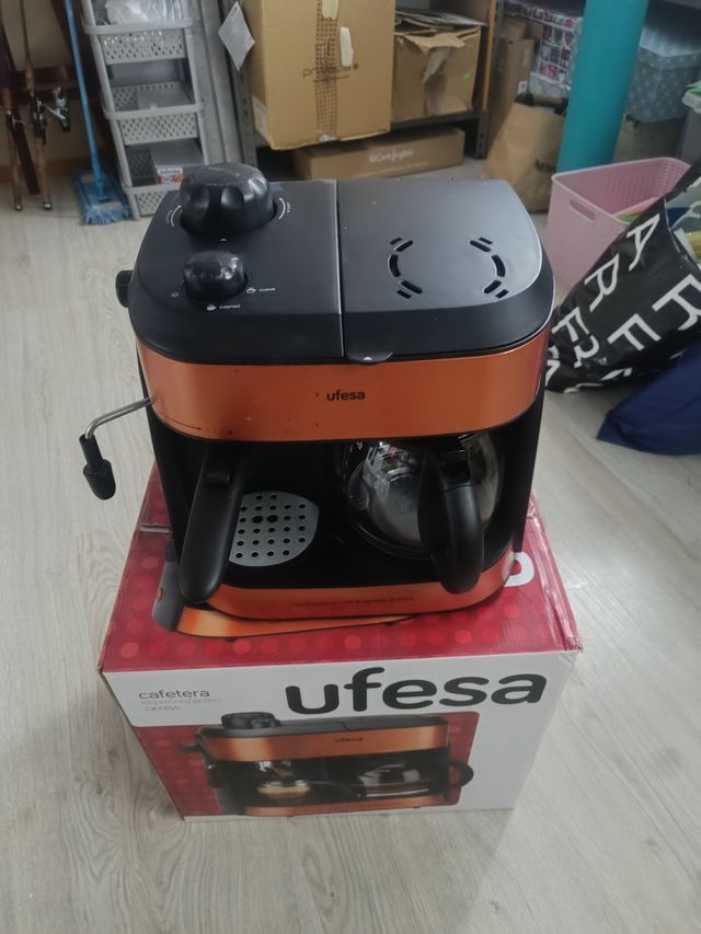 Detalles del productoCafetera Ufesa CK7355 con acabado en naranja y negro. Permite preparar café espresso y de goteo. Le falta el recipiente pequeño pero no es nacesario con poner una taza sirve