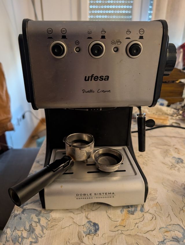 Cafetera expresso Ufesa Duetto Creme usada, en buen estado. - Modelo Duetto Creme. - Sistema doble: Espresso + Monodosis. - Incluye portafiltros y filtros.