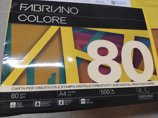 Detalles del productoCaja de 2500 folios de papel Fabriano Colore en tamaño A4 y gramaje de 80gr/m², de color amarillo.