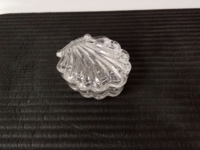 Detalles del productoPreciosa caja de cristal tallado con forma de concha. Ideal para guardar joyas u otros objetos pequeños.