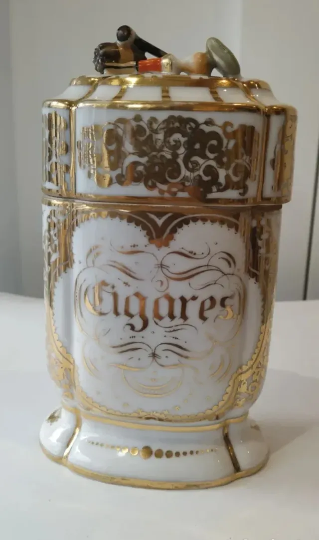 Detalles del productoElegante caja antigua para cigarros, elaborada en porcelana blanca con detalles dorados.