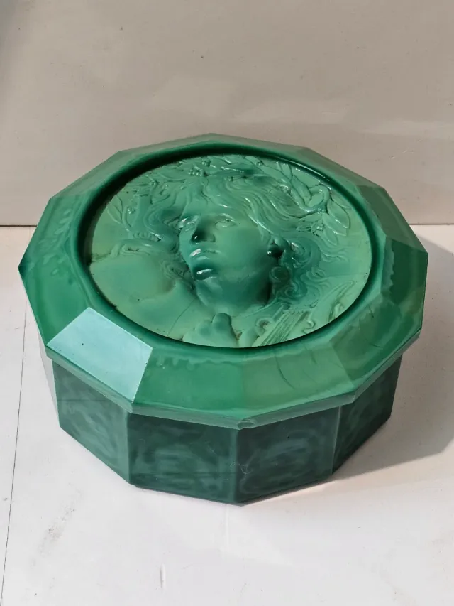 Caja de cristal verde con relieve.