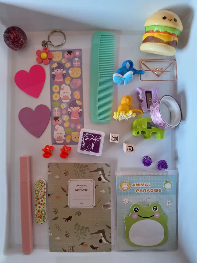 Incluye una selección variada de artículos de papelería y accesorios decorativos, perfecta para organizar tu escritorio, hacer manualidades o tener un detalle original.