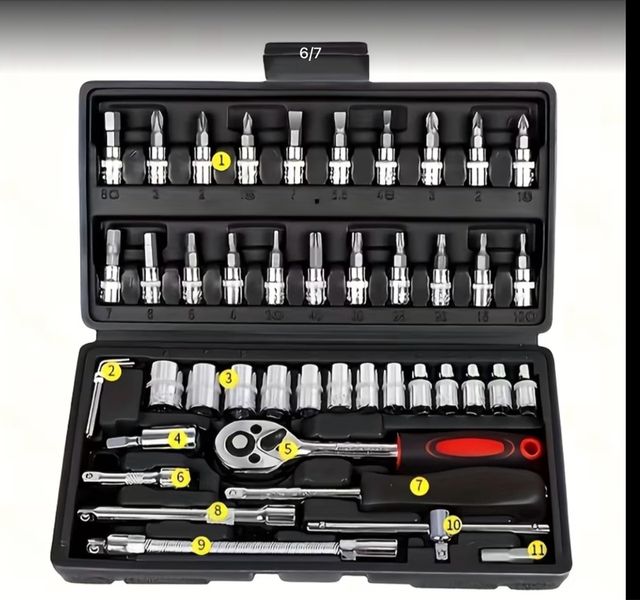 Set de herramientas manuales en su estuche. - Incluye llaves de vaso, puntas y carraca. - Estuche organizador de plástico resistente.