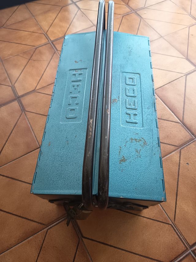 Detalles del productoCaja de herramientas metálica de color azul con asas.