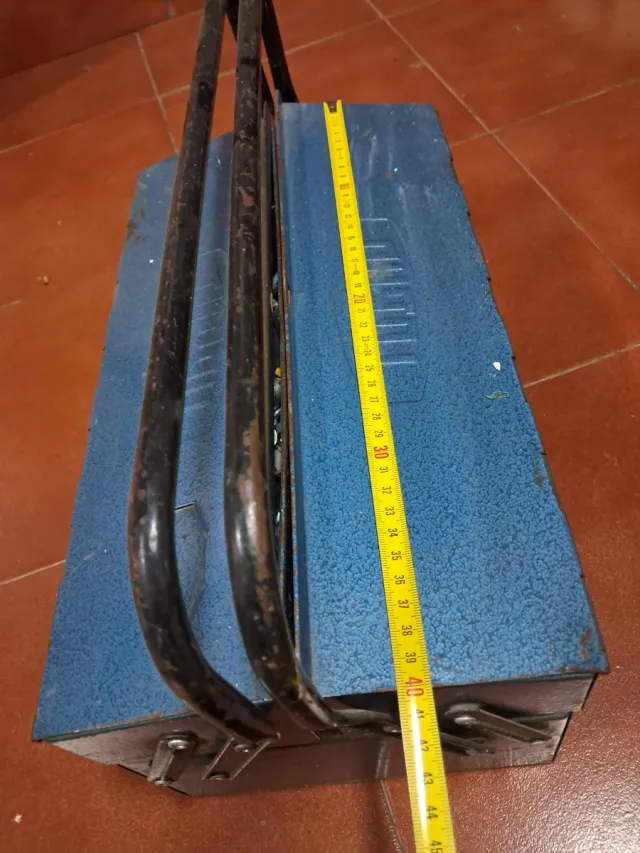 Detalles del productoCaja de herramientas de metal de color azul. Es robusta y tiene un asa para facilitar su transporte.
