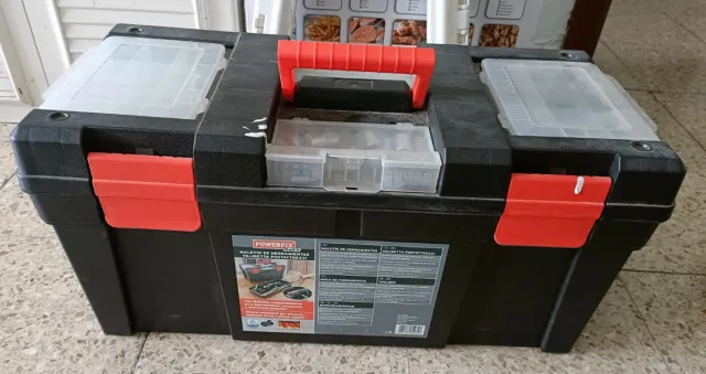Detalles del productoCaja de herramientas de plástico resistente, ideal para organizar y transportar tus herramientas.