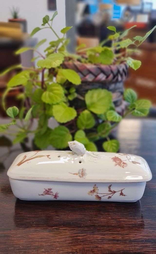 Preciosa caja de peines o de cepillos de dientes de loza muy antigua con sellos en relieve.
