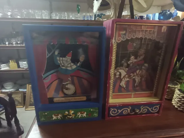 Caja de músical antigua de cuerda con escena de circo y payaso en movimiento. Funciona la melodía al abrir el cajón. 50€ cada una.