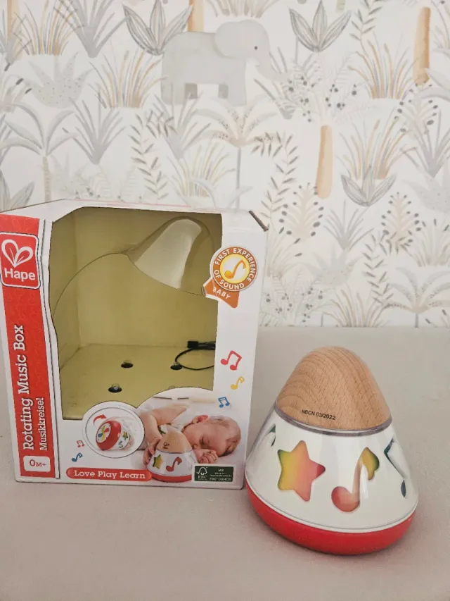 Detalles del productoCaja de música giratoria de la marca Hape, ideal para bebés. Presenta un diseño colorido con estrellas y notas musicales.