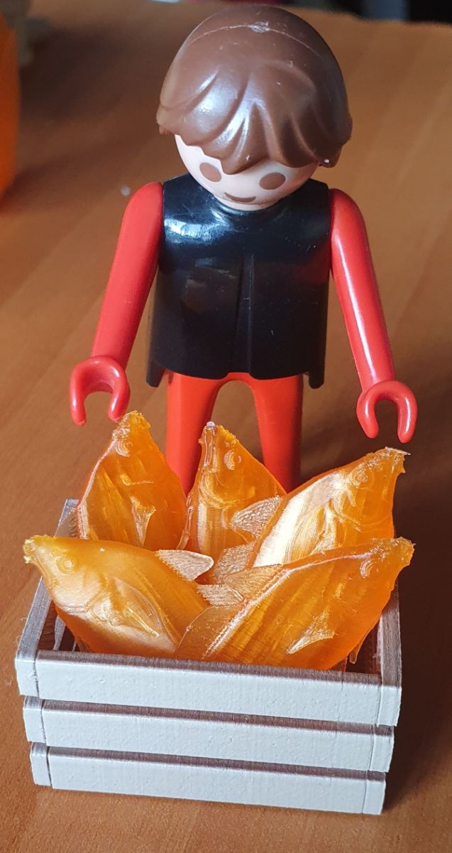 Caja de madera con peces decorativos. - Peces de color naranja translúcido. - Diseño detallado de escamas y aletas.