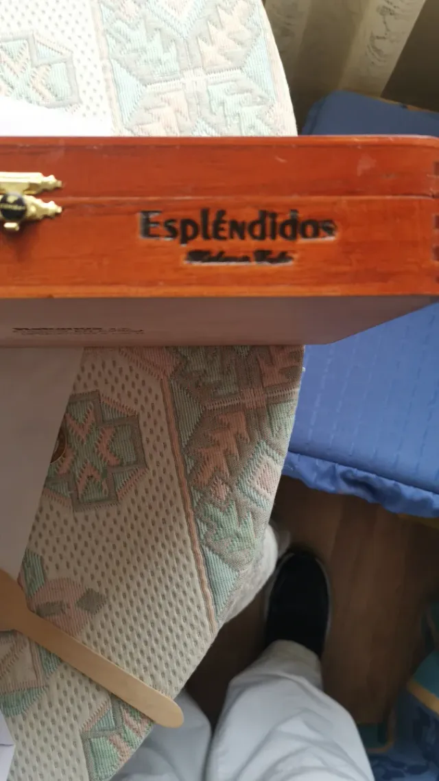 Elegante caja de madera para puros con la inscripción Espléndidos. - Tapa de madera con detalles dorados. - Inscripción Espléndidos en la tapa.