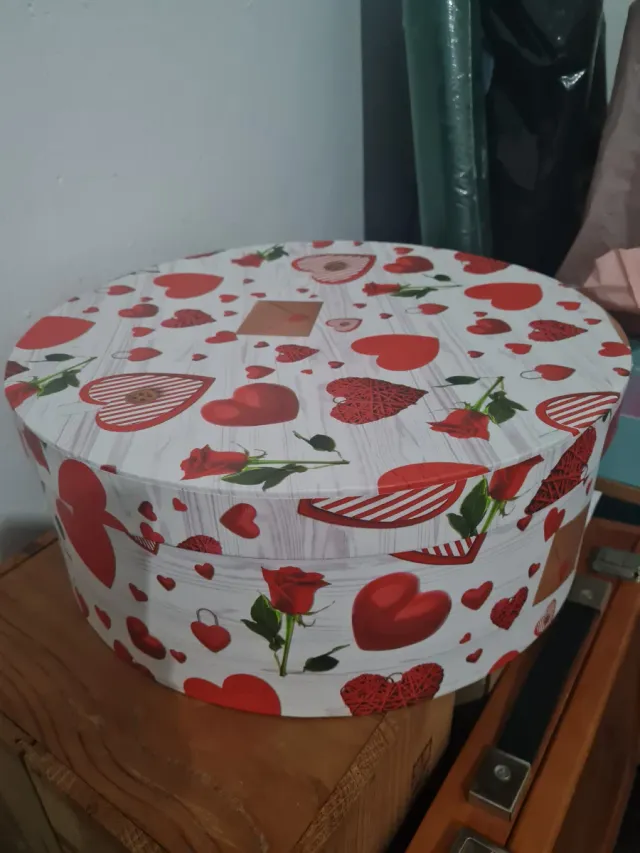 Detalles del productoCaja redonda de gran tamaño, perfecta para envolver regalos especiales. Su diseño está decorado con un patrón de corazones rojos y rosas, junto con detalles de cintas y hojas.