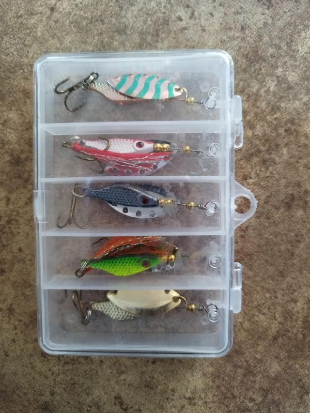 Caja de señuelos. Nuevos sin estrenar. Son metálicos. Acepto cambio relacionado con los pájaros.