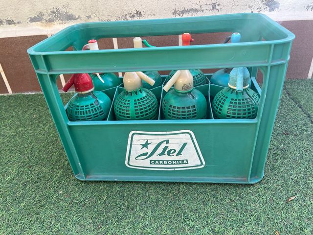 Caja de plástico verde para transportar sifones. Tiene un diseño resistente y práctico. - Capacidad para varios sifones. - Color verde. - Marca Stel Carbonica visible.