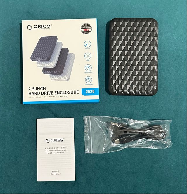 Detalles del productoCarcasa externa para disco duro 2.5 marca ORICO para HDD/SSD SATA III de 7mm y 9.5mm hasta 6 TB, Sopporta UASP, con Cable USB, con conexión USB C.