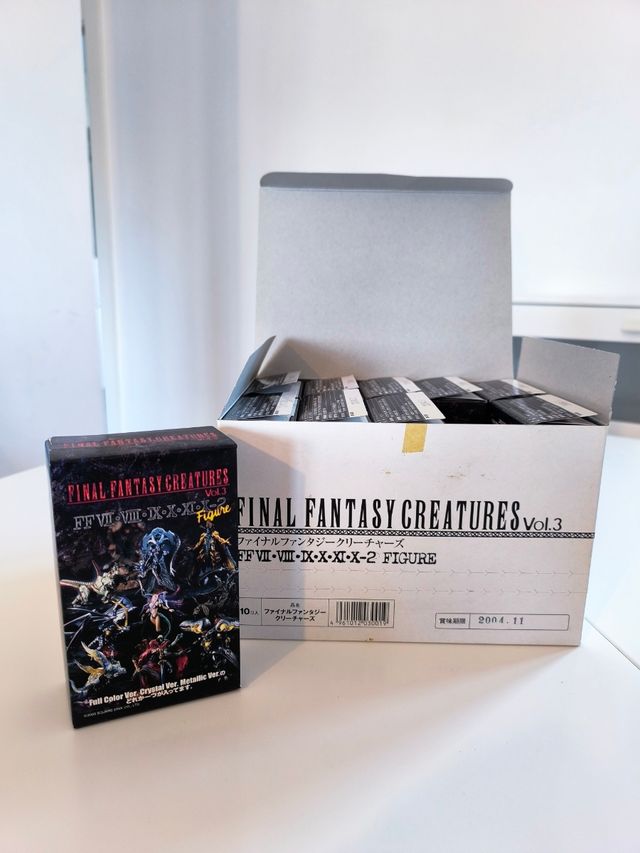 Detalles del productoCaja de distribución de 10 figuras del volumen 3 de Final Fantasy Creatures. Año 2004, Japón. Las 10 figuras son las versiones transparentes de la colección, cajas abiertas pero figuras selladas en sus bolsas de plástico.