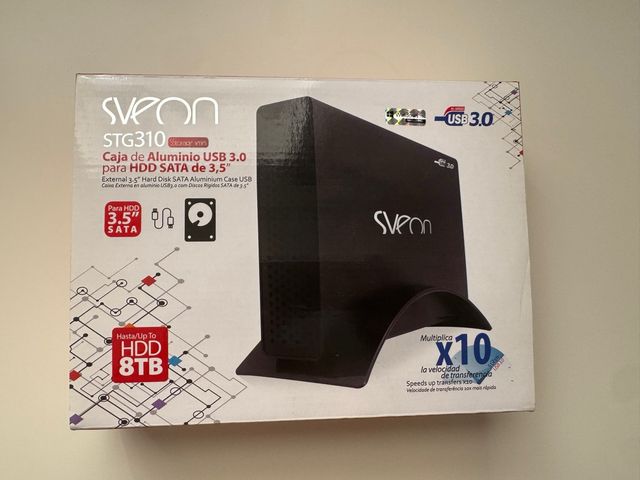 Detalles del productoVendo caja externa para disco duro Sveon STG310. Es una carcasa de aluminio para discos duros SATA de 3,5", con conexión USB 3.0. - Permite discos duros de hasta 8TB. - Incluye la caja y soporte. - Está en perfecto estado.