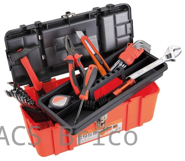 Solución para personal con necesidades de desplazamiento, o bricolador casero para hacer los arreglos precisos. Conjunto de alicates, llaves de apriete, destornilladores y muchas mas herramientas con una caja amplia.