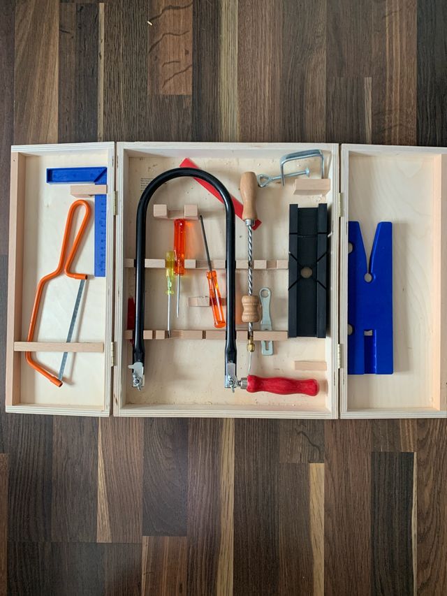 Detalles del productoPreciosa caja de madera para herramientas de carpintería, ideal para niños y adolescentes. Es perfecta para guardar y transportar las herramientas de forma organizada.