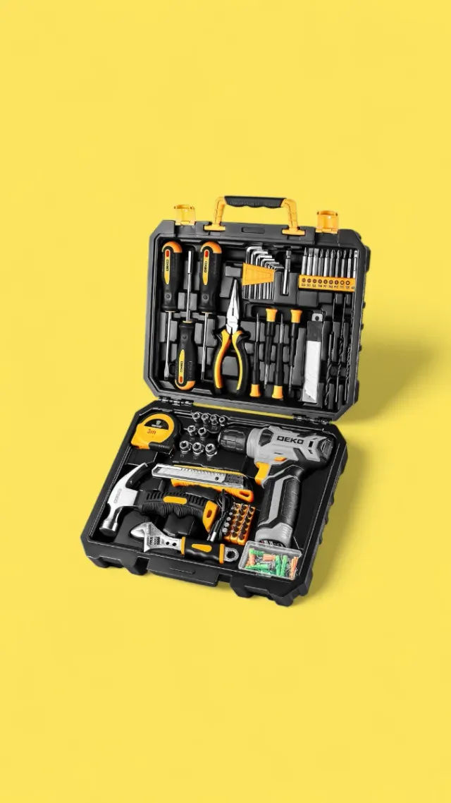 Detalles del productoCompleta caja de herramientas con un destornillador eléctrico y diversos accesorios.