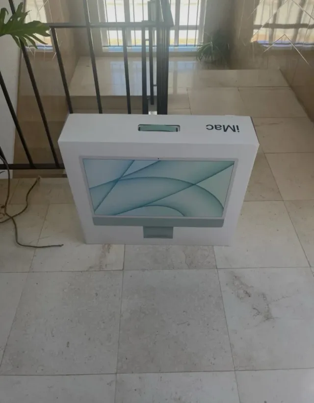 Caja original para iMac de Apple. - Diseño blanco y minimalista. - Asa superior para facilitar el transporte.