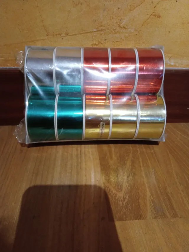 Caja con 10 rollos de lazo ancho metalizado para regalo ,de colores surtidos.Cada rollo contiene 10 metros.Disponibles 5 cajas.