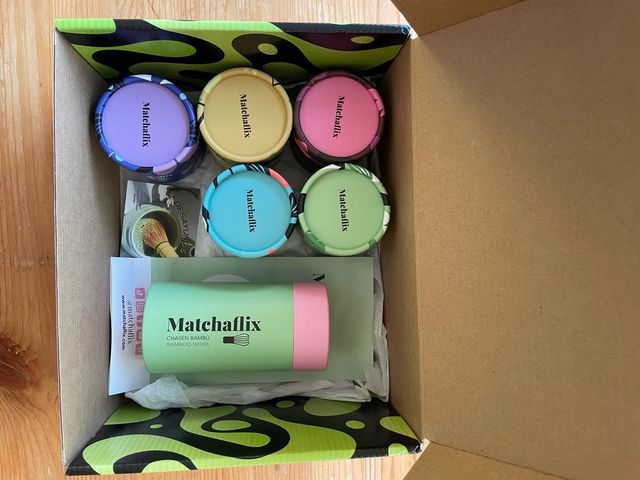 Caja Matchaflix con 5 tipos de té matcha y batidor