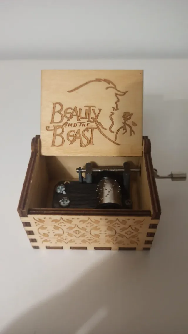 Detalles del productoVendo esta preciosa caja de música artesanal con grabado de La Bella y la Bestia.