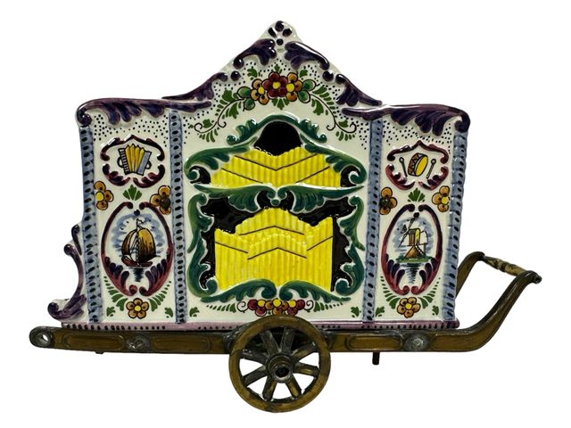 Detalles del productoPreciosa caja musical vintage de cerámica, inspirada en el estilo Delft de Holanda. Presenta un diseño detallado con escenas marinas y elementos decorativos.