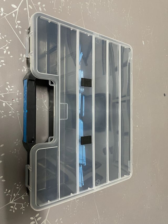 Detalles del productoPráctica caja para mantener tus objetos ordenados. Fabricada en plástico transparente con divisiones interiores.