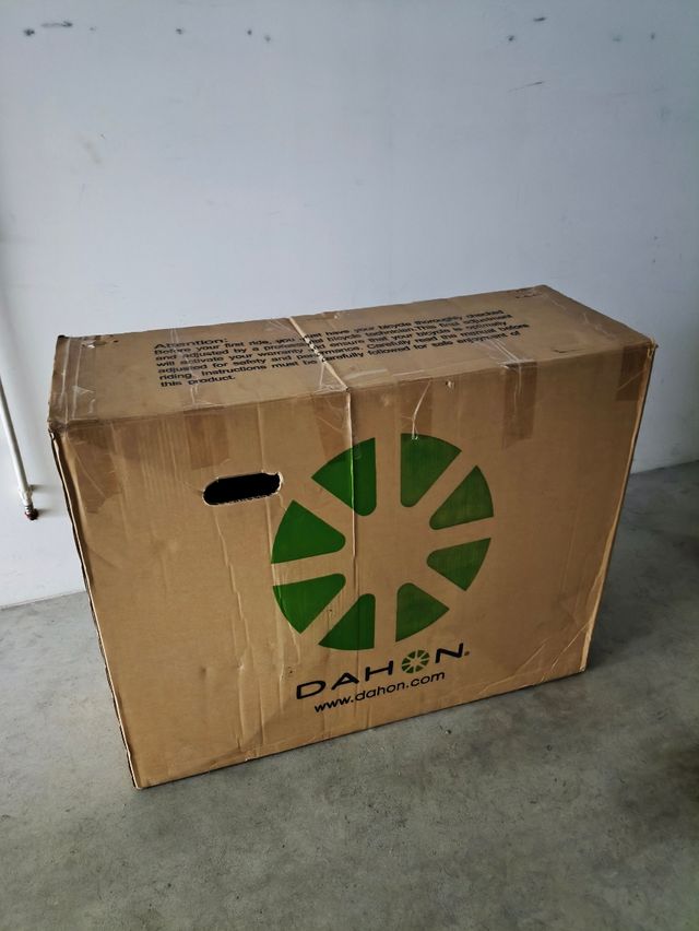 Caja original para bicicleta plegable Dahon. - Caja de cartón. - Logo de Dahon impreso. - Incluye asa para transporte.