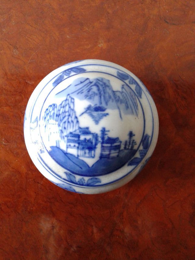 Detalles del productoPreciosa caja vintage de porcelana china, ideal para guardar pequeños objetos. Es pequeña y redonda, con un diseño azul y blanco que representa una escena de montaña. Diámetro: 10 cm. Altura: 6 cm. Perfecta para coleccionistas.