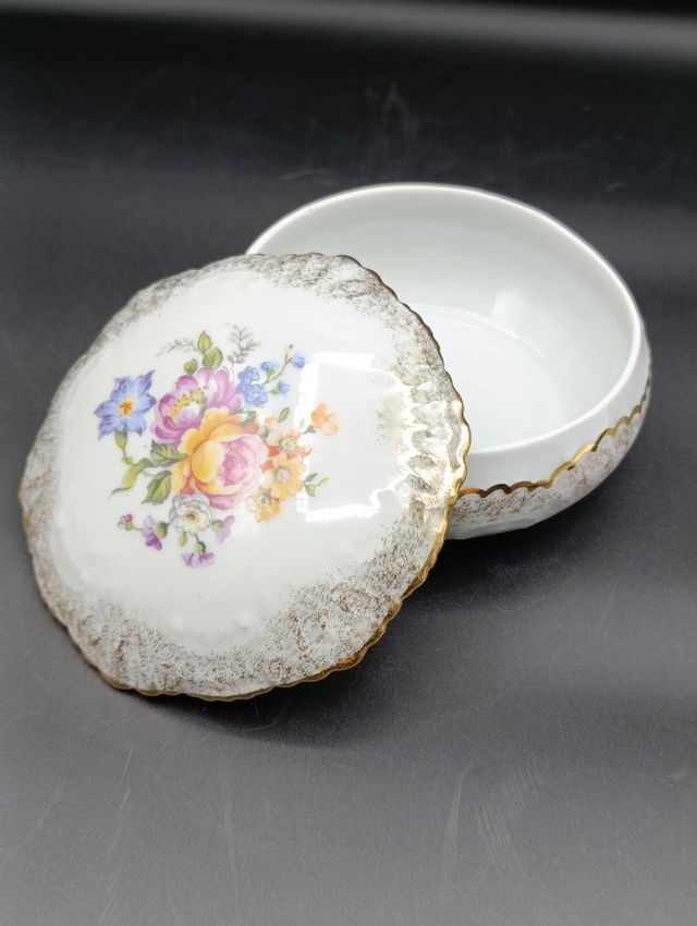 Detalles del productoElegante caja de porcelana estilo vintage de Limoges. Ideal para guardar pequeños objetos o como pieza decorativa. Diseño con dorados y flores.