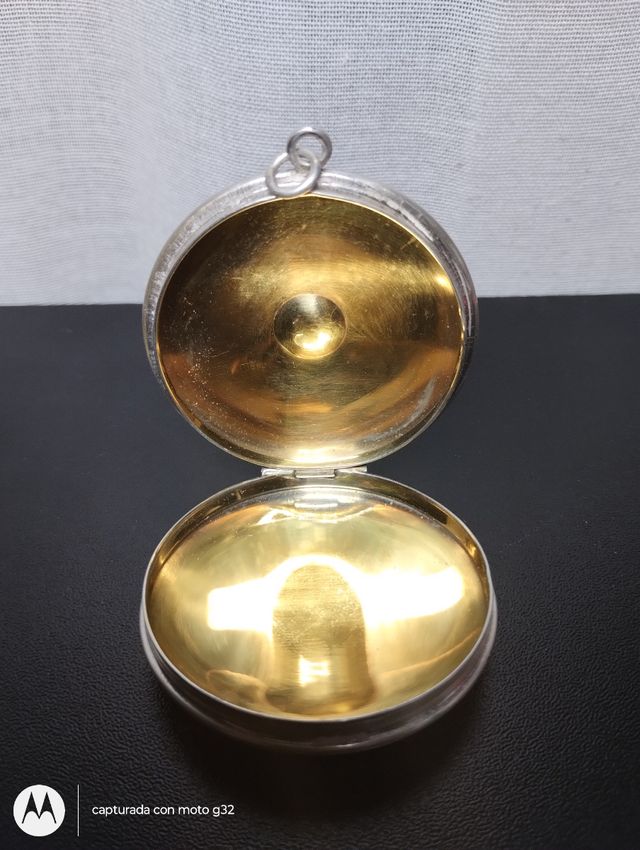 Antigua caja porta viático, serigrafiada en 1983 de plata española 916 y chapado en oro en muy buenas condiciones. Peso, 42 gramos Medidas, 5,5×1 cms.