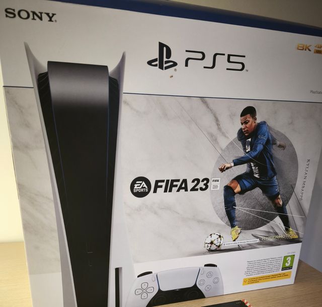 Caja original de la consola PlayStation 5, edición estándar. - Diseño con temática de FIFA 23 Ultimate Team. - Incluye asa para transporte.