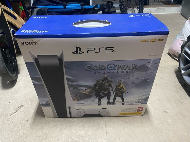 Detalles del productoCaja de la consola PlayStation 5 con diseño especial de God of War Ragnarök.