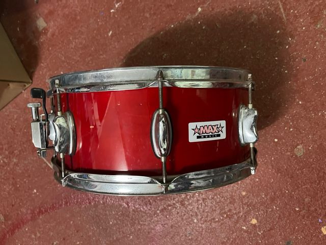 Caja/redoblante de la marca MAX Music en color rojo. - Cuerpo de tambor rojo brillante. - Aros metálicos. - marca MAX Music. Se ha utilizado para batería.