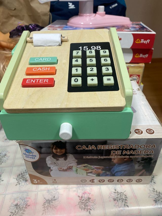 Detalles del productoJuguete de caja registradora de madera, ideal para que los más pequeños jueguen a comprar y vender.