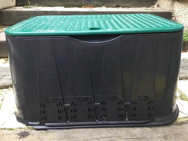 Detalles del productoCaja de registro para sistemas de riego. Fabricada en plástico resistente y con tapa verde. Nunca se ha usado pero tiene rota una pequeña parte de la pestaña de borde, se ve en la última foto.