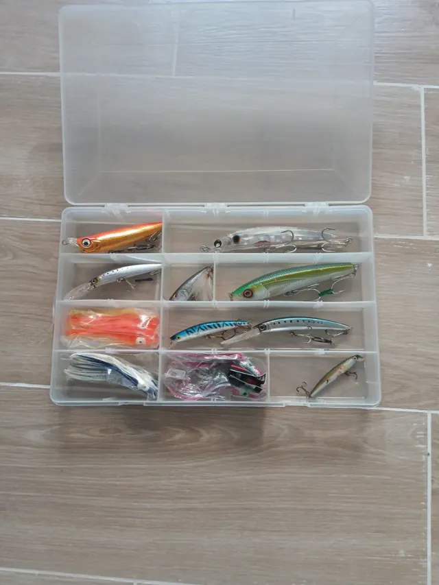 - Incluye señuelos tipo popper, minnow y otros.