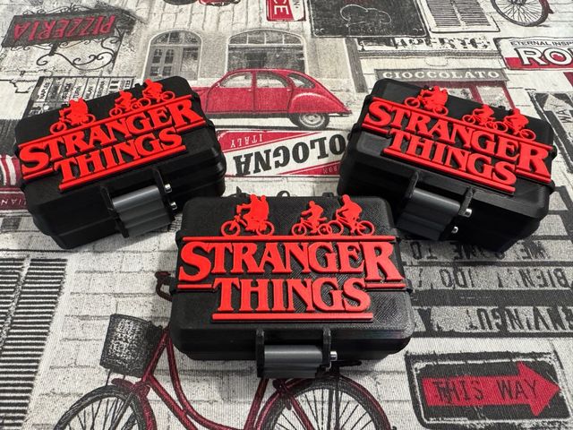 Detalles del productoCaja diseñada e impresa en 3d de Stranger Things. Presenta el logo icónico de la serie y siluetas de los personajes.