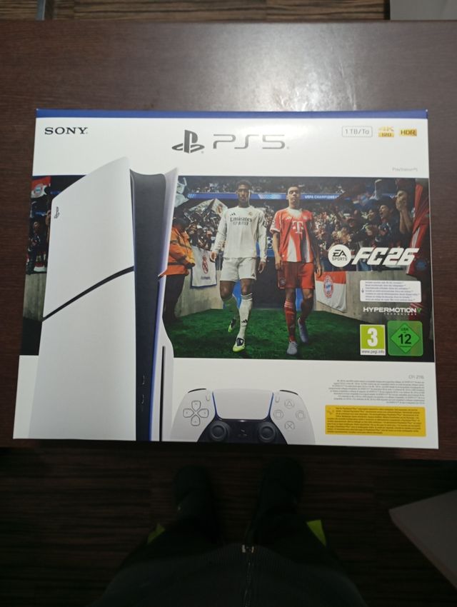 Caja original de la consola PlayStation 5 edición FC 26. - Incluye la caja exterior e interior. - Diseño blanco y negro.