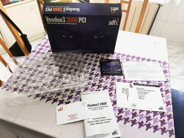 Caja original para la tarjeta gráfica Voodoo3 2000 PCI. Perfecto estado de conservación, incluye manuales y accesorios.